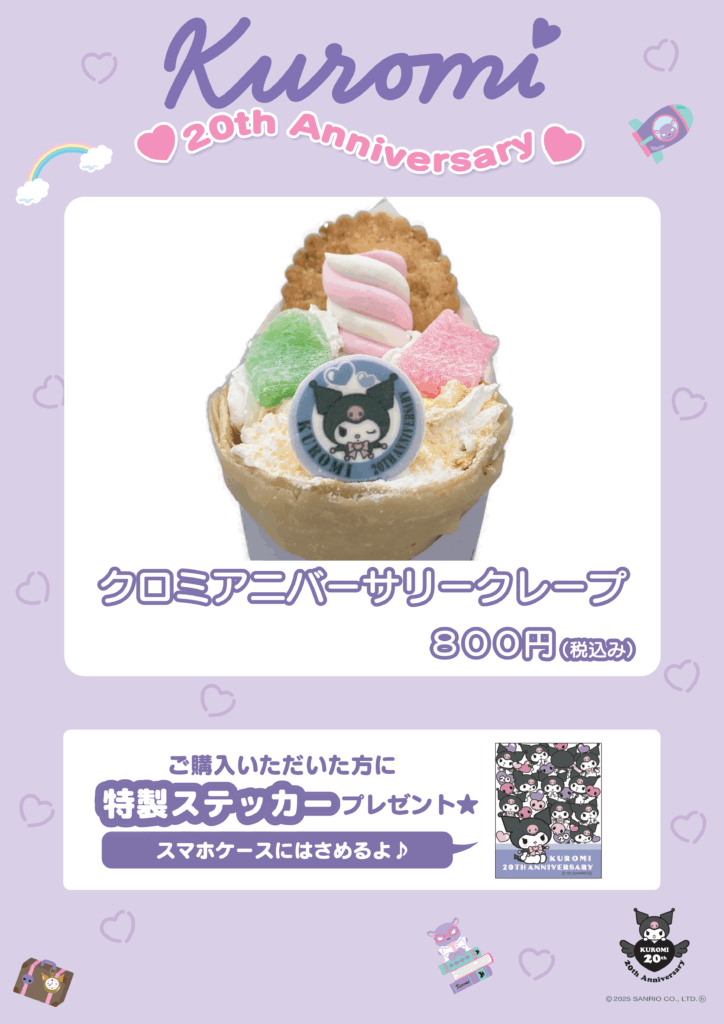 1999.01.01 お知らせ クロミアニバーサリークレープ(期間限定)販売中♪ 「クロミ」20thを記念してサンリオカフェワゴンでクロミアニバーサリークレープ(期間限定)を販売します!クレープ1個に限定のノベルティシールをプレゼント! ※クロミアニバーサリークレープは限定商品のためなくなり次第終了します♬